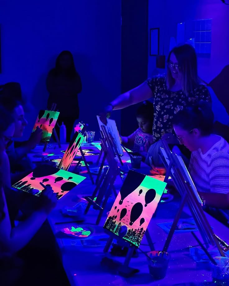 Under enchanting blacklights, kids create glowing masterpieces using vibrant UV paints, guided by our fun and friendly instructors. It’s interactive, unique, and guaranteed to keep everyone smiling from start to finish!