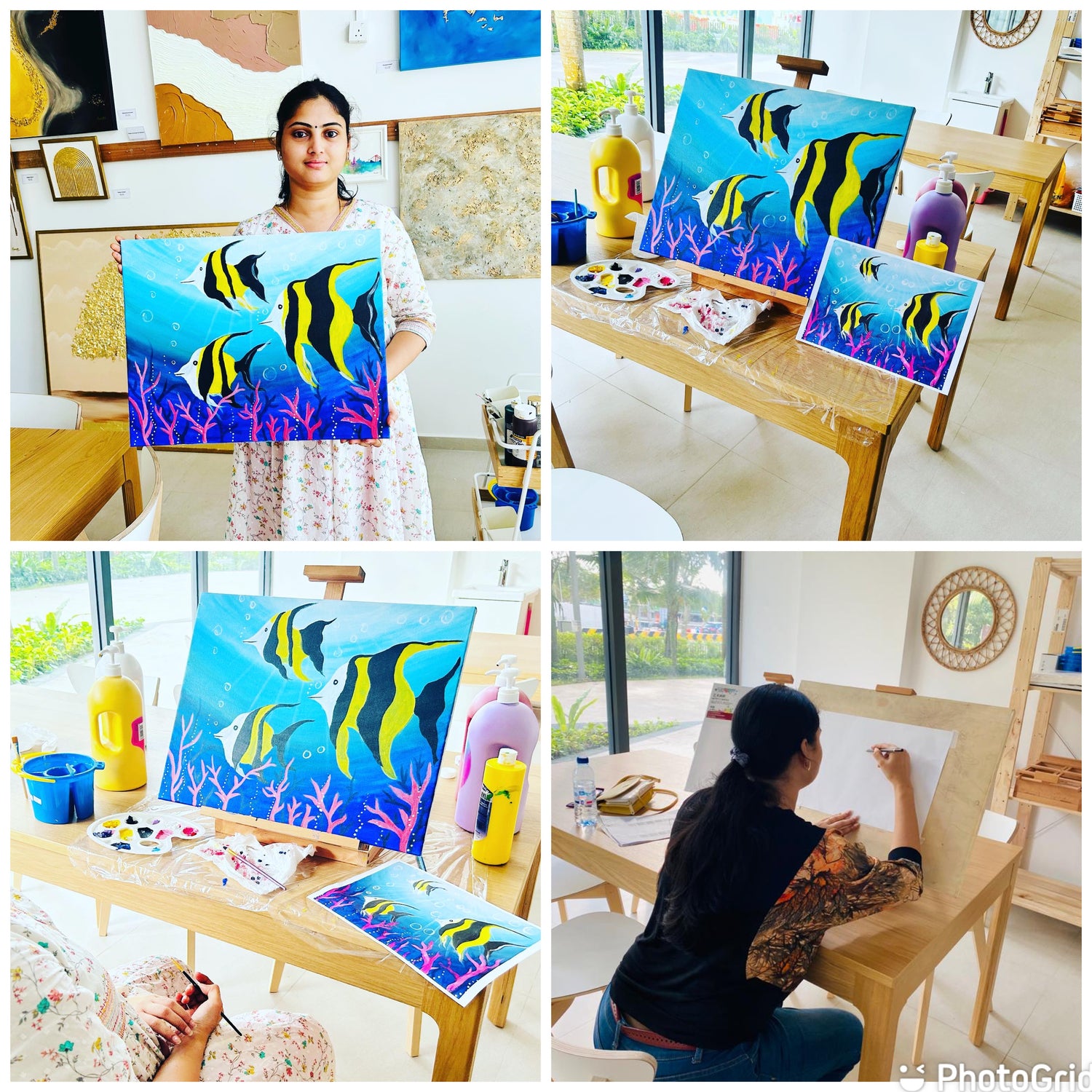 "It was my first time attending a guided glow in the dark painting session and it was amazing! Not a person who is good in arts but at MurcyArt Gallery, they guided me so patiently and I ended up being able to paint this beautiful picture and loved every bit of this, very therapeutic and can’t wait to be back!"--- Jeena Mary