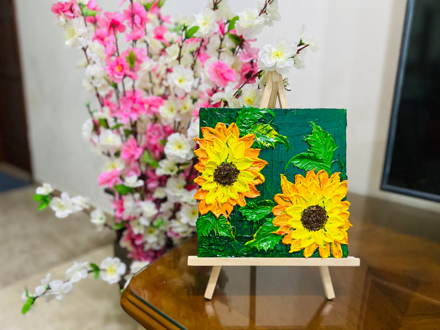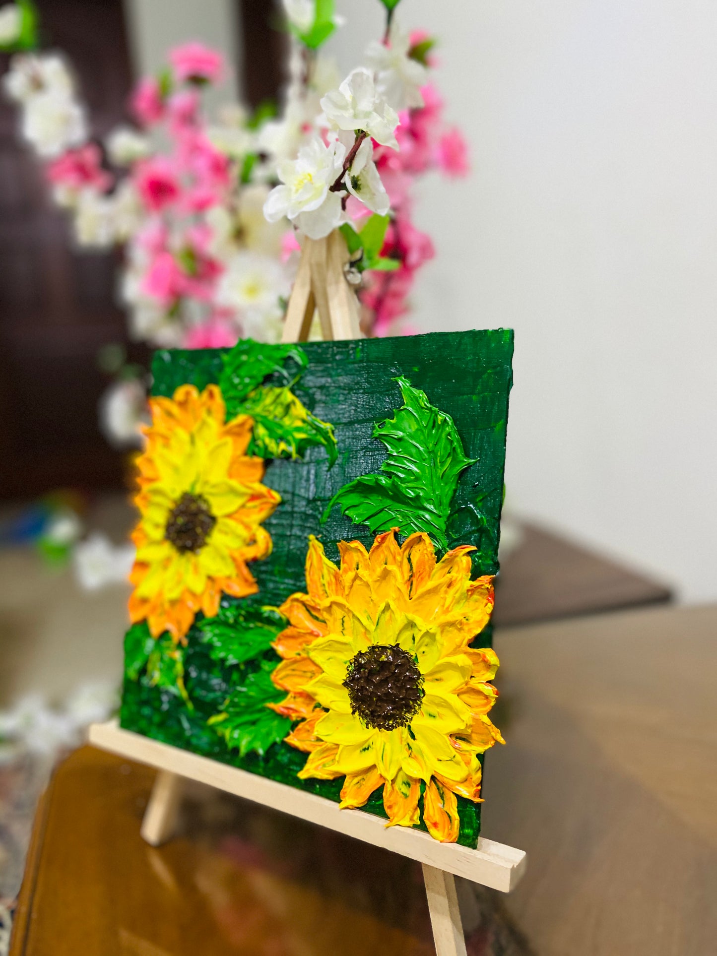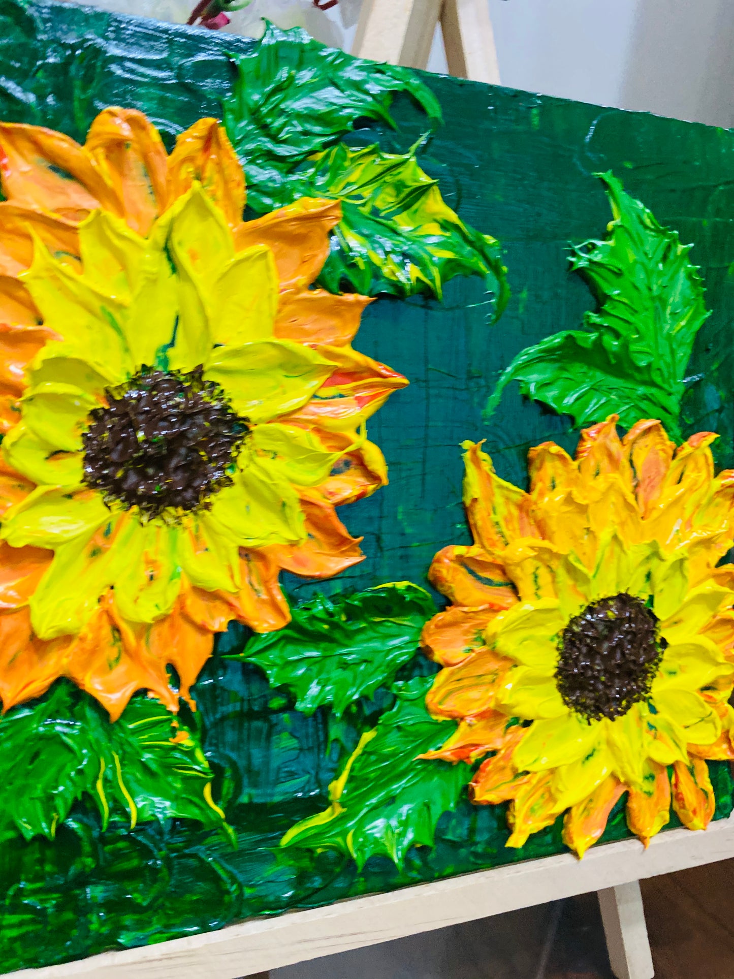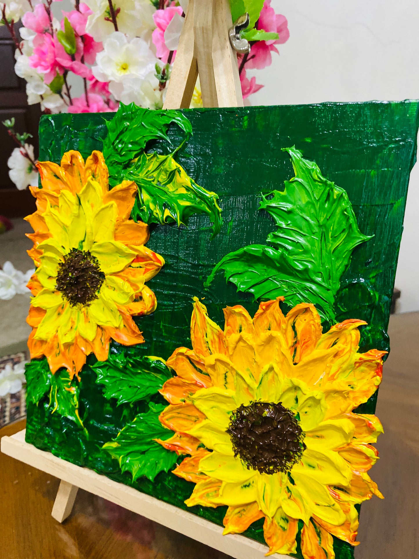 - Original Acrylic Painting with heavily textured creamy, real leaves and sunflowers.